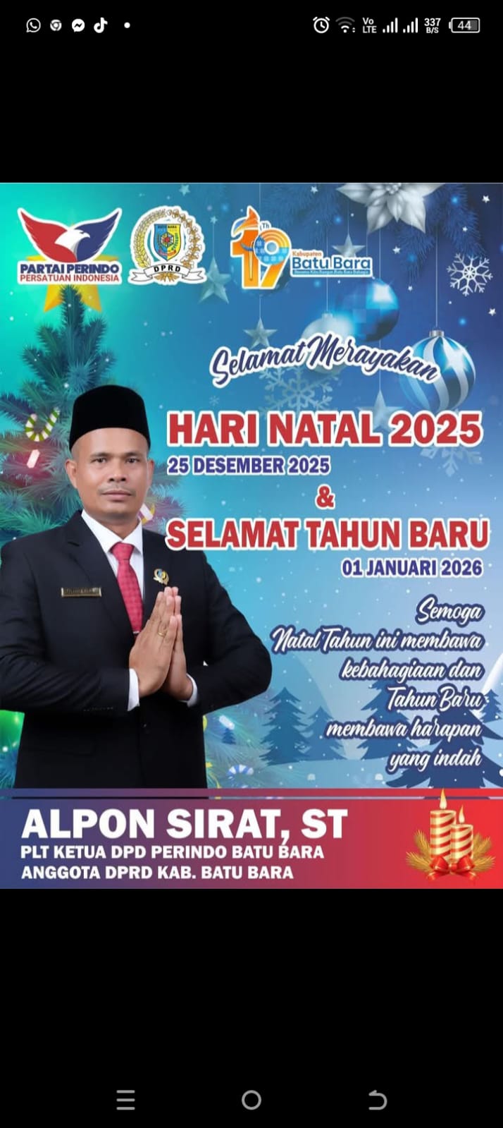 Bupati dan Wakil Bupati menyampaikan ucapan Selamat Natal kepada seluruh umat Kristiani di Kabupaten Batu Bara. Syukur alhamdulillah, perayaan Natal berjalan dengan aman, tertib, dan penuh sukacita. Ini merupakan hasil dari kebersamaan, saling menghormati, dan kuatnya nilai toleransi yang telah terbangun dengan baik di daerah kita. Papar Alfon