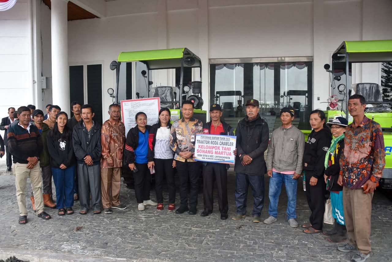 Doloksanggul-Mediadelegasi: Bupati Humbahas Dr Oloan P Nababan SH MH didampingi para pimpinan OPD (Organisasi Perangkat Daerah) serahkan bantuan 2 (dua) unit traktor roda crawler kepada kelompok tani bertempat di Kantor Bupati Humbahas Bukit Inspirasi Doloksanggul, Kamis 21 Agustus 2025.