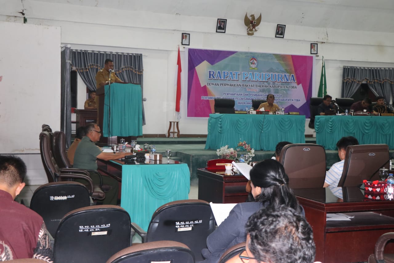 Balige-Mediadelegasi: Bupati Kabupaten Toba Provinsi Sumatera Utara, Effendi SP Napitupulu jawab pandangan umum (PU) enam (6) fraksi DPRD Toba perihal pertanggung jawaban pelaksanaan APBD Tahun Anggaran (TA) 2024.