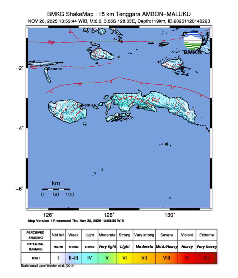 Ambon-Mediadelegasi : Gempa bumi dengan magnitudo (M) 6,0 mengguncang Ambon, Maluku, pada hari Kamis, 20 November 2025, pukul 13.59 WIB. Guncangan gempa ini dirasakan hingga wilayah Papua Barat, menimbulkan kekhawatiran di kalangan masyarakat.