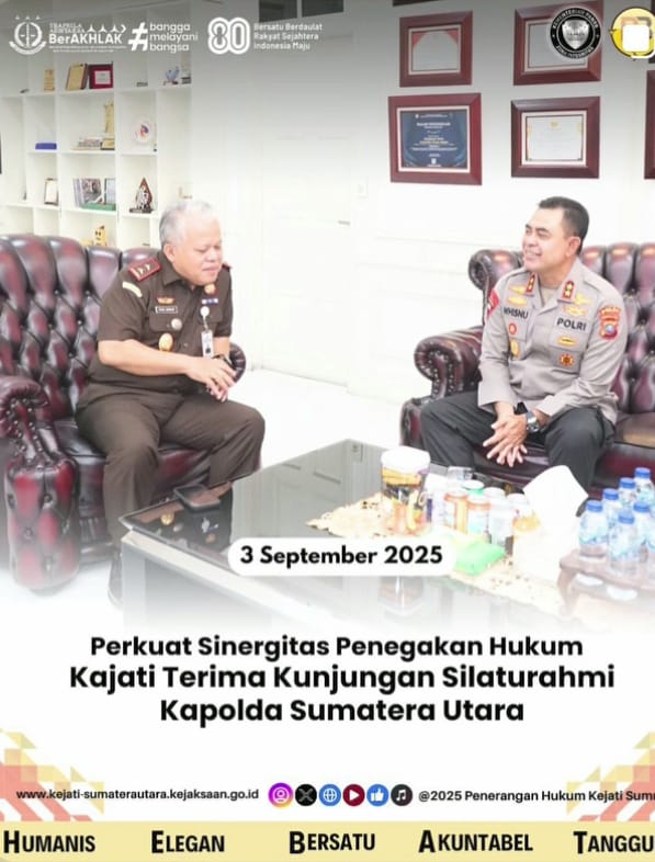 Medan-Mediadelegasi : Kepala Kejaksaan Tinggi Sumatera Utara (Kajati Sumut), Dr. Harli Siregar, S.H., M.Hum., menerima kunjungan silaturahmi Kepala Kepolisian Daerah Sumatera Utara (Kapolda Sumut), Irjen Pol. Whisnu Hermawan. Pertemuan ini berlangsung di ruang kerja Kajati, Jalan Jenderal AH Nasution, Medan, pada Rabu (3/9/2025).