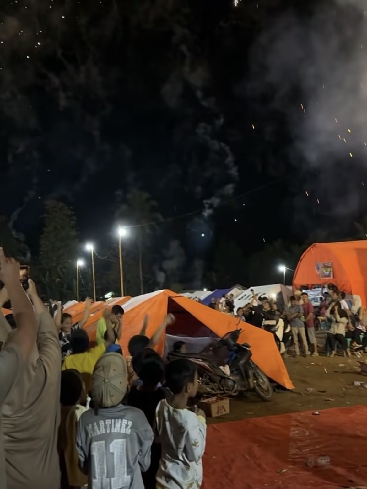 Dalam rekaman tersebut, warga tampak berkumpul di area posko pengungsian, menyaksikan kembang api yang dinyalakan secara terbatas. Usai momen pergantian tahun, sebagian warga terlihat menari Tabole-bole, menciptakan suasana hangat di tengah kondisi darurat yang masih mereka jalani.