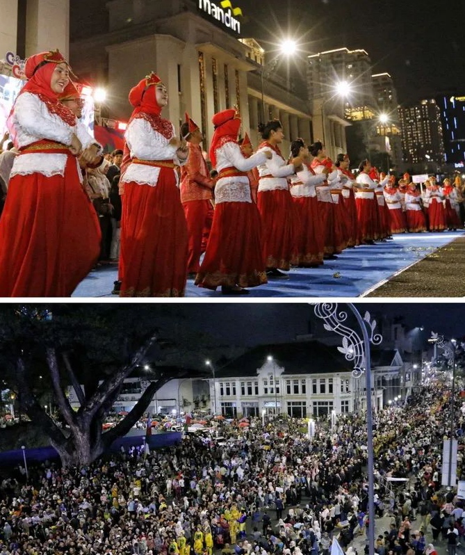 Medan-Mediadelegasi: Ribuan warga memadati kawasan Lapangan Merdeka Medan, Sabtu (5/7) malam, untuk menyaksikan Parade Budaya Colorful Medan Night Carnival 2025.