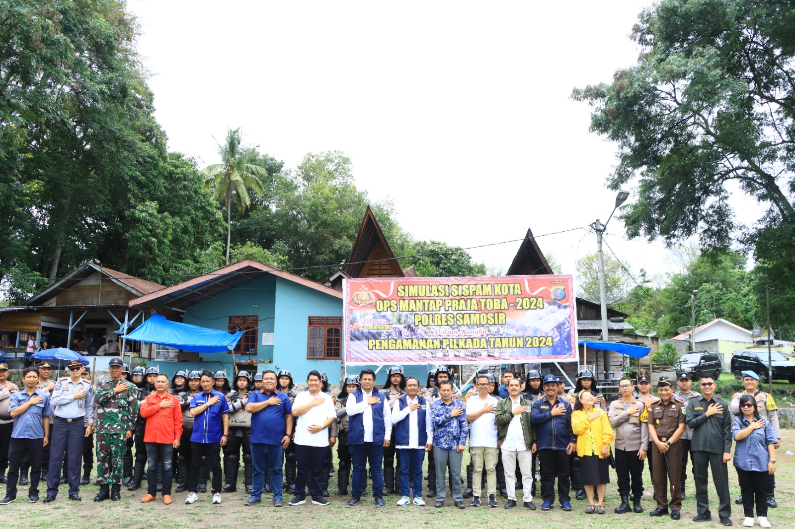 Samosir-Mediadelegasi: Polres Samosir menggelar simulasi Sispamkota dan penandatanganan deklarasi Pilkada Damai 2024 pada Selasa, 24 September 2024, di Lapangan Pangururan. Kegiatan ini dihadiri oleh pasangan calon Bupati dan Wakil Bupati, KPU, Bawaslu, DPRD, serta perwakilan partai politik dan tokoh masyarakat.