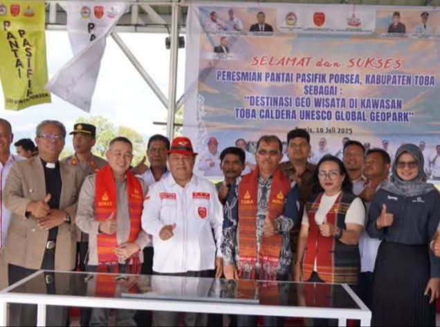 Peresmian Geowisata Pantai Pasifik Porsea ditandai dengan penandatanganan prasasti oleh oleh Wakil Bupati Toba Audi Murphy Sitorus, General Manager Badan Pengelola Toba Caldera UNESCO Global Geopark (BP-TCUGGp) Azizul Kholis dan Ketua Umum Komite Masyarakat Danau Toba (KMDT) Edison Manurung.